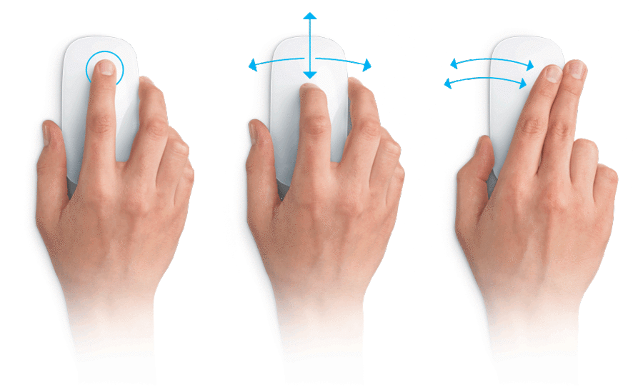 Для прокрутки, например, документа вверх, вниз, влево или вправо просто проведите пальцем по поверхности Apple Magic Mouse в соответствующем направлении - никаких колесиков, кликов и движений мышью. Причем подобный сенсорный скроллинг работает в любом месте поверхности мыши, т.е. Вам не нужно обязательно держать руку на ней.